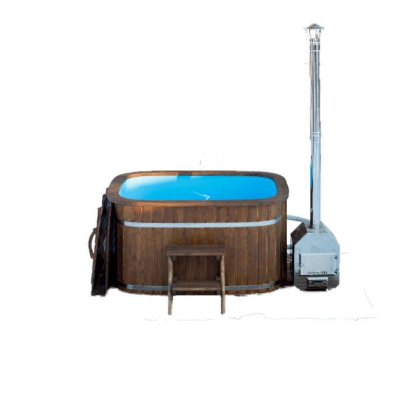 Elegantní dřevěný koupací sud hranatého tvaru s polypropylenovou vložkou. Kamna jsou umístěna vedle sudu, díky čemuž budete mít maximum prostoru.