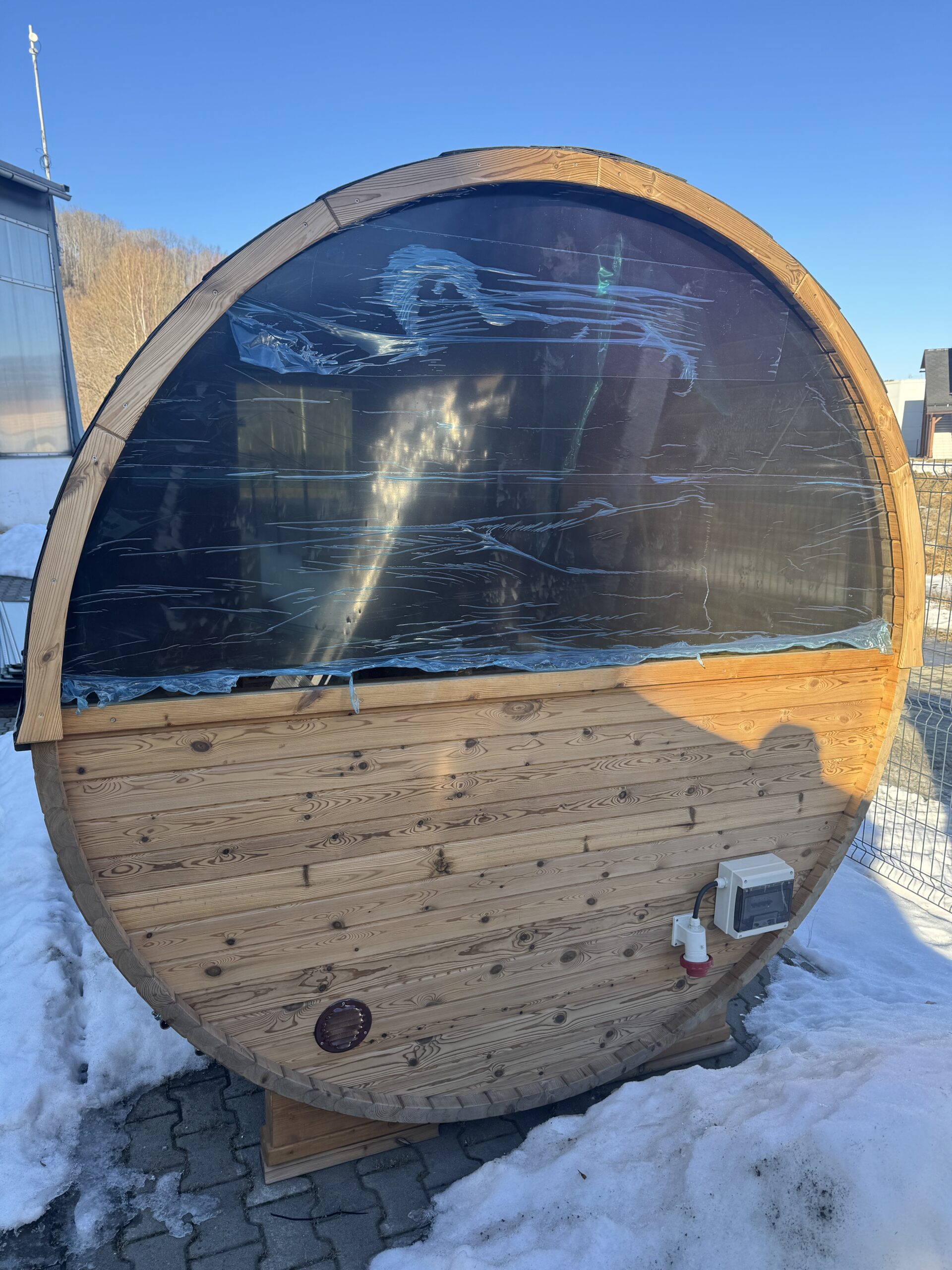 Thermowood sudová sauna délky 300 cm s předsíní a velkým panoramatickým oknem. Kamna na dřevo. Okamžitá dostupnost. Vytvořte si zahradní wellness.